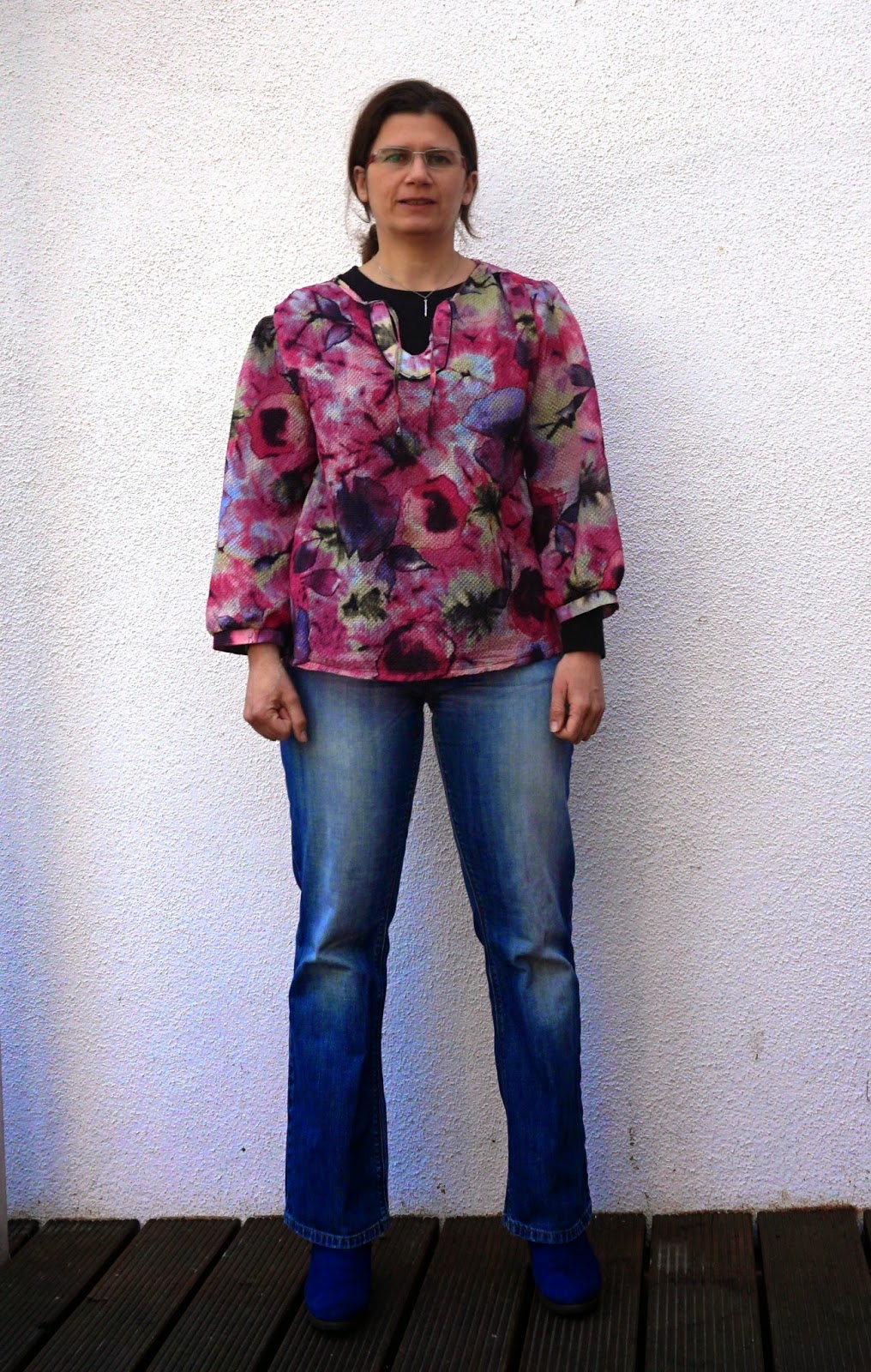 trage ich aber meine erste genähte Bluse mit Langarmshirt drunter. Mehr dazu hier.