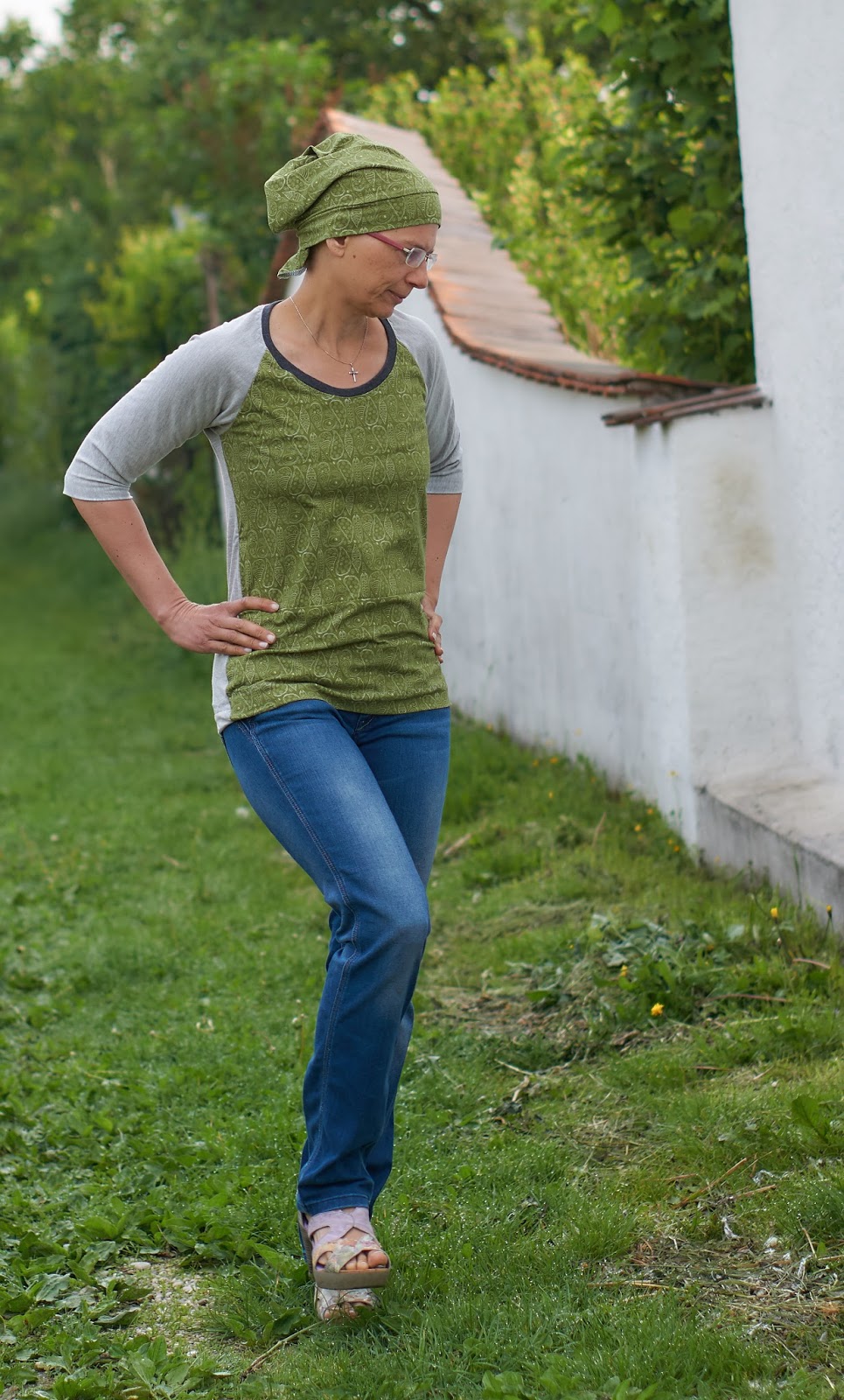Ich musste ihn vorne stückeln, da ich zuerst mein Kopftuch draus genäht hatte und so nicht viel Stoff übrig war.