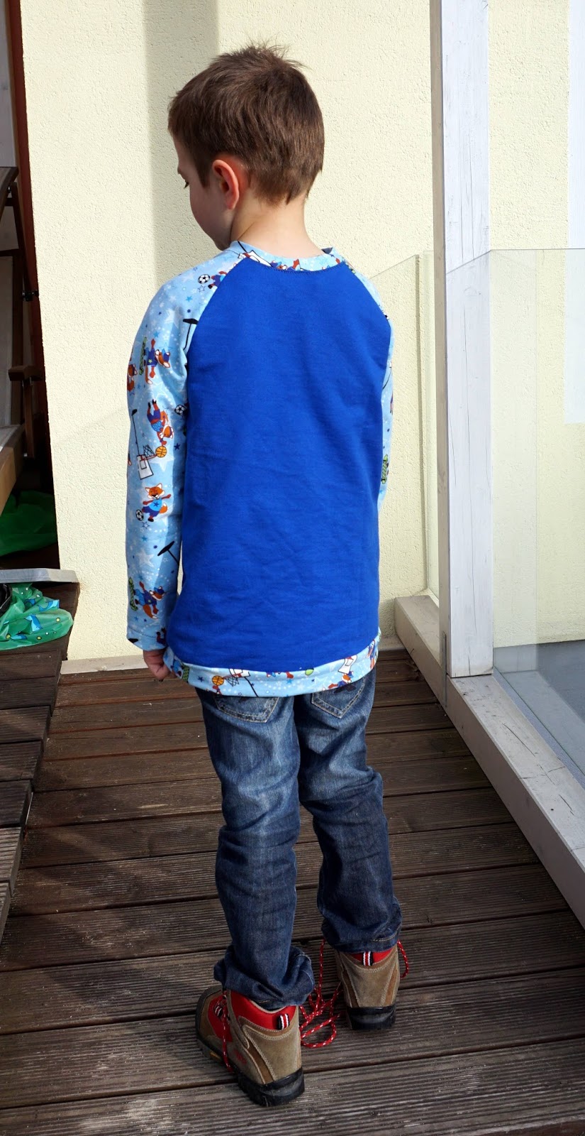 Für den Grossen ist es ein Raglanshirt in Gr. 134 von Klimperklein geworden. Der blaue Stoff ist ein kaum dehnbarer Sweat von Trigema.