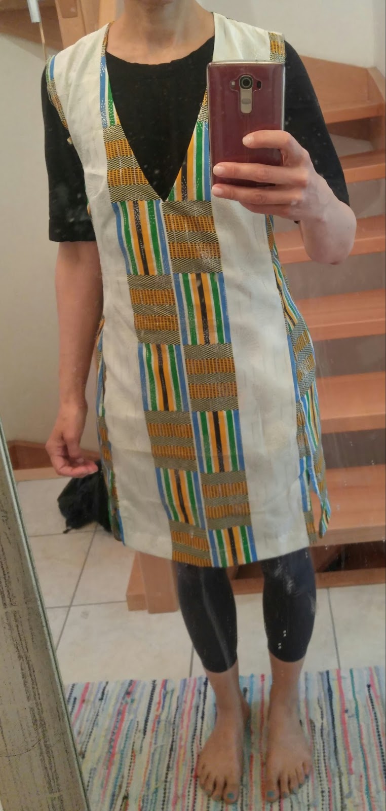 Der Waxprint hat leichte erhobene Aufdrucke, die glänzend sind. Hat eine Zeit gedauert, bis ich draufgekommen bin, wie ich den am besten bügle, nämlich mit einem Küchentuch zwischen dem Bügeleisen und dem Stoff. Davor hatte ich schon was am Bügeleisen kleben. Der erste Versuch war, nur von der Rückseite zu bügeln, aber das geht halt schlecht an den Stellen, wo der Stoff umgeschlagen wird. Da hab ich nur noch Aussenseite.