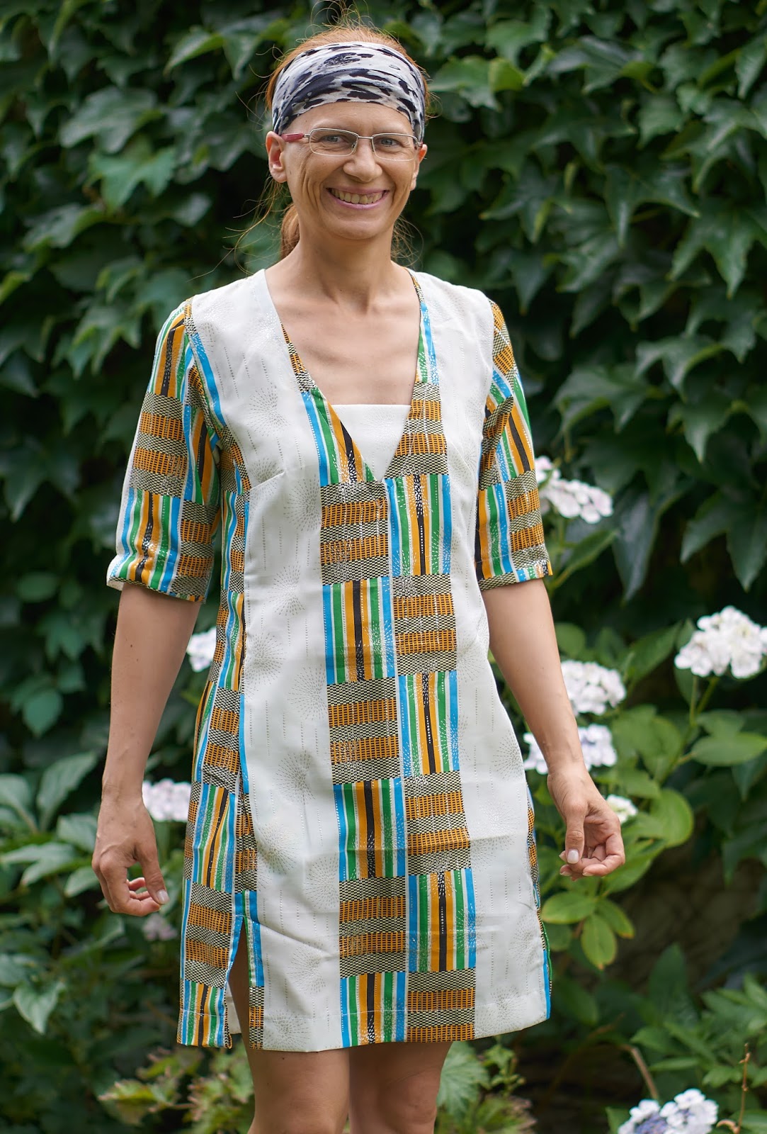 Mir fiel schon auf den Vorschau-Design-Bildern auf, dass der Ausschnitt viel zu tief sitzt. Daher habe ich gleich am Schnittmuster den Ausschnitt höher gesetzt (und auch am Beleg). Ich habe mich länger mit den Taschen abgeplagt, die Abnäher b´gingen recht zügig (ich schlage da immer mit Heftfaden durch: also die mittigen Punkte und die Endpunkte, wenn das Schnittteil noch auf dem Stoff auflieg).Mit dem Waxprintstoff sieht es ganz anders, aber richtig toll aus!