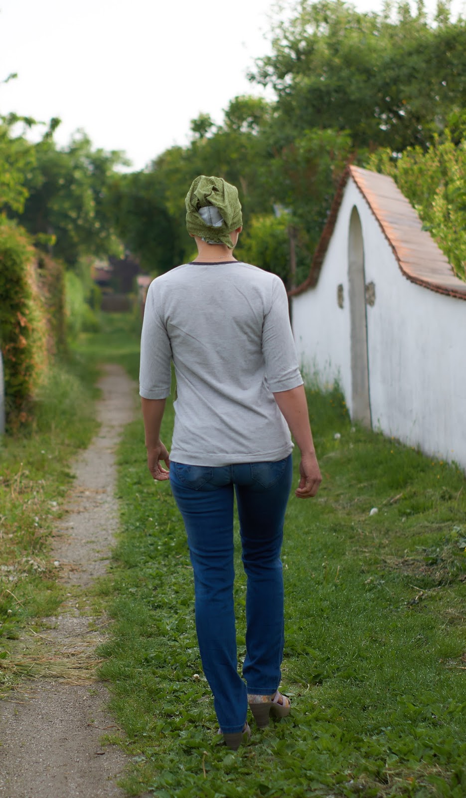 Ich musste ihn vorne stückeln, da ich zuerst mein Kopftuch draus genäht hatte und so nicht viel Stoff übrig war.
