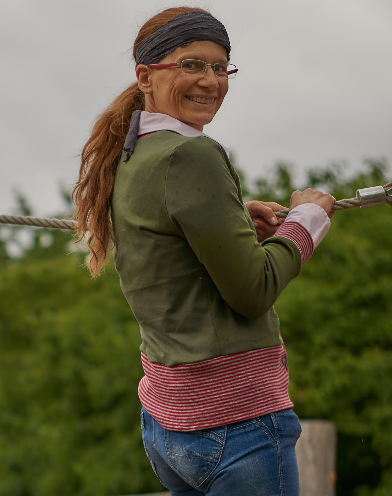Die Ärmel sind mir etwas kurz geraten. Das liegt aber nicht am Schnittmuster sondern an mir. Ich hatte gesehen, dass die Ärmel recht lang ausfallen. Und ich bin nicht lang. Hab mir dann einfach das Teil für den Ärmel an die Schulter gehalten und auf gut dünken abgeschnitten. So halt wie ich gemeint habe, dass es dann mit dem Bündchen unten bis sicher ans Handgelenk gehen wird. Mein Augenmaß ist eindeutig verbesserungswürdig, bzw sollte ich das nächste Mal besser aufs Massband zurückgreifen.